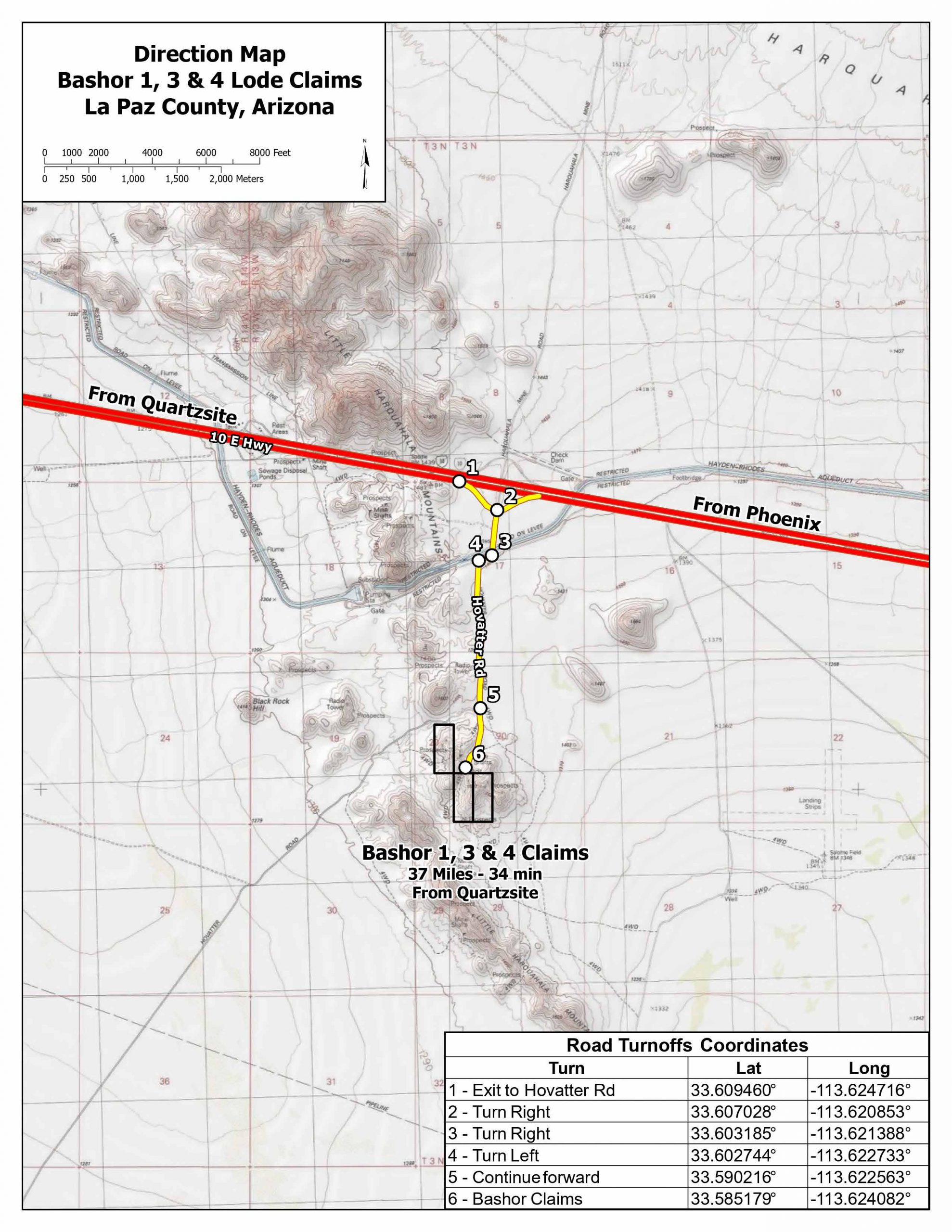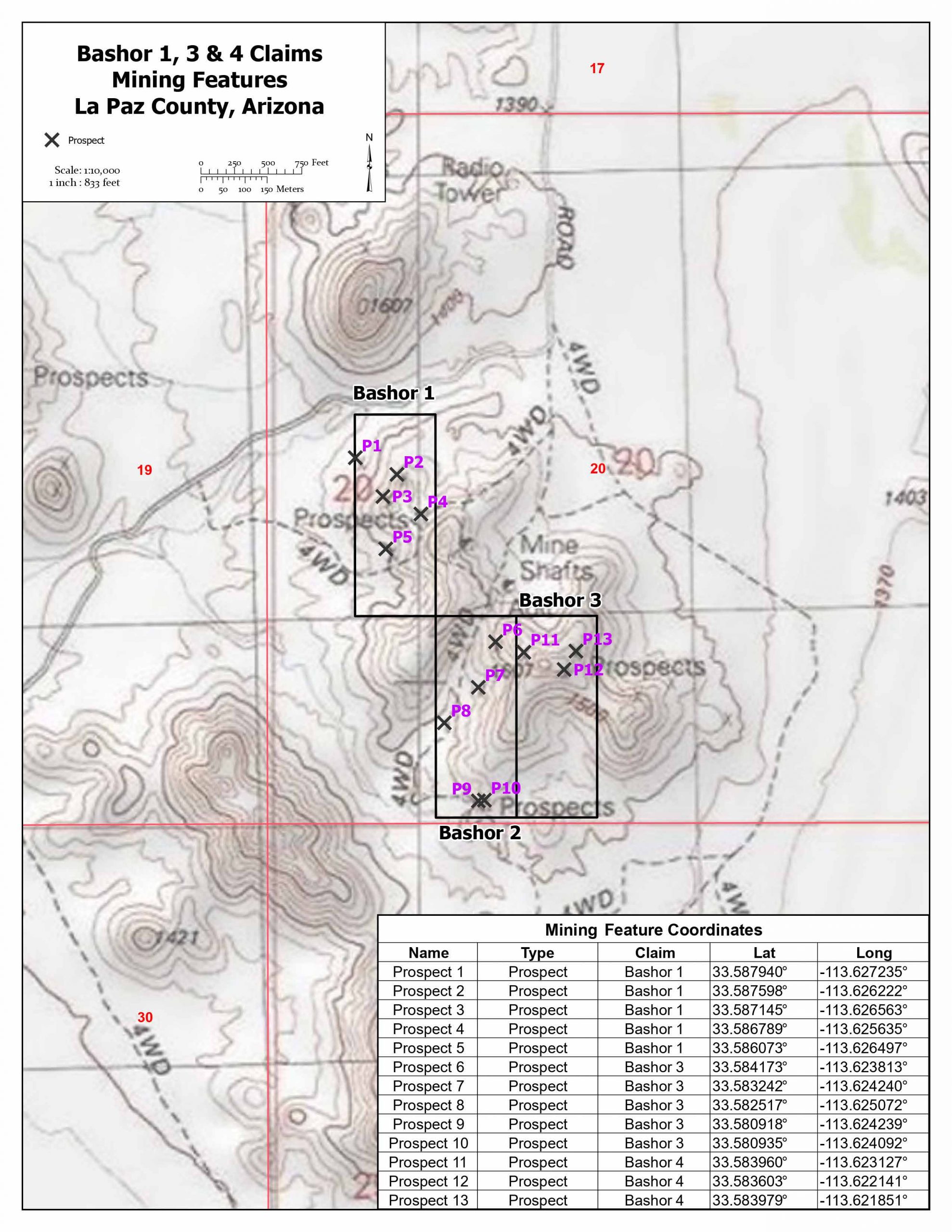 The Bashor Group consists of three (3) unpatented lode claim covering 61.98 acres on federal land managed by the U.S. Bureau of Land Management. The claims cover a former producing gold-silver mine located in the Ellsworth / Little Harquahala Mining District in La Paz County, Arizona.