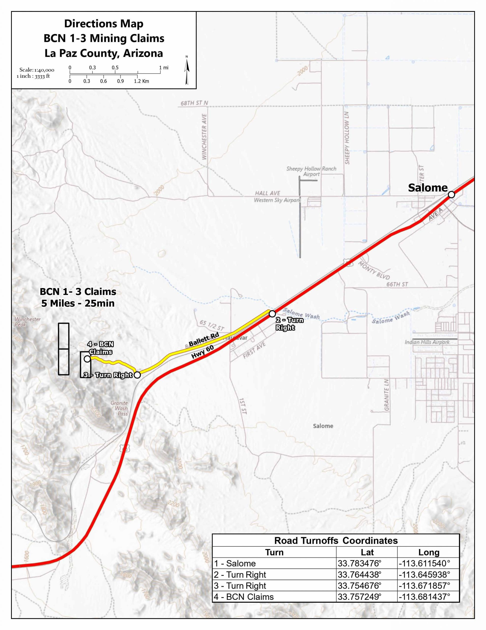Location and Access: From Salome, Arizona take Highway 60 2.1 miles south to Ballet Road turnoff. Follow Ballet Road 1.5 miles south to turnoff for mine road. Drive .5 miles directly to claims.