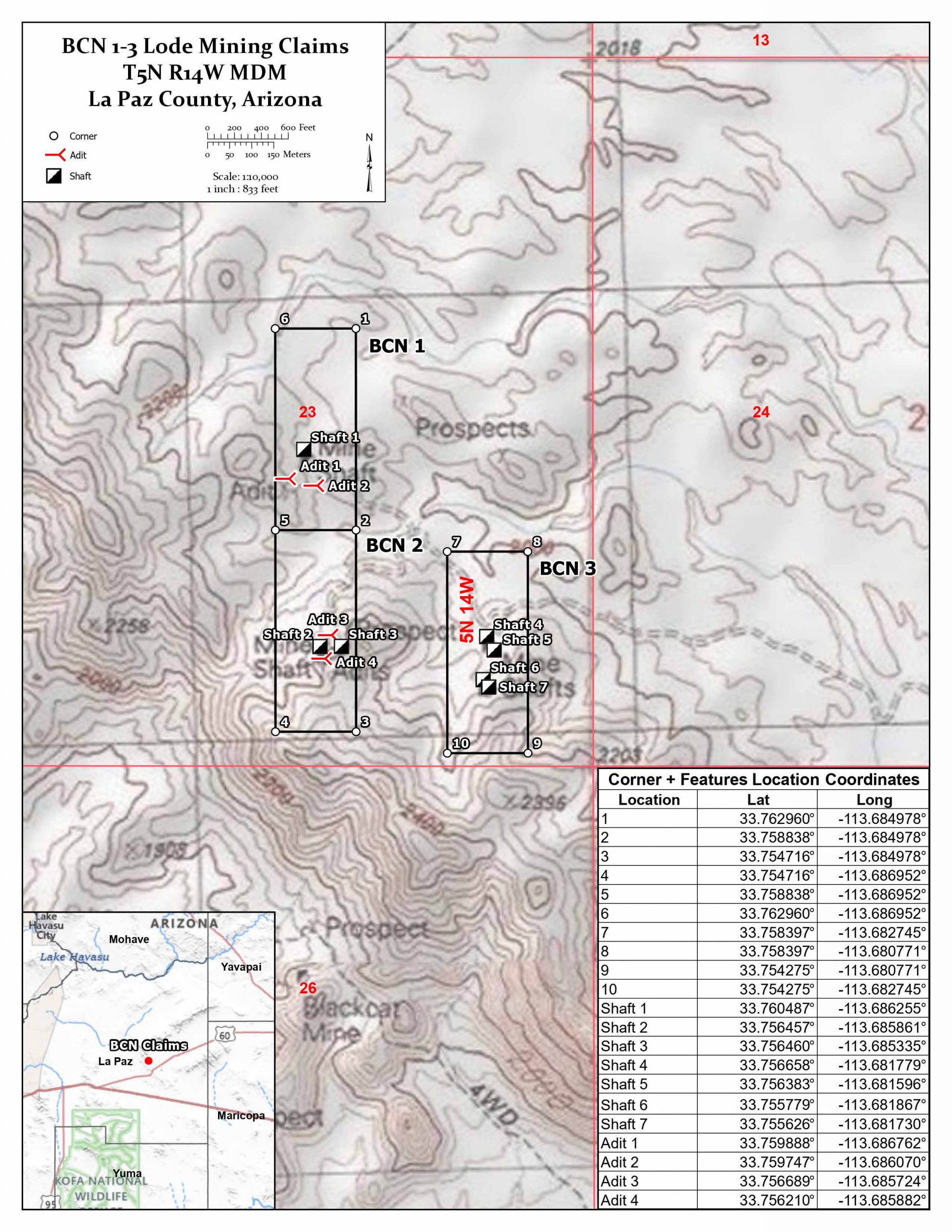GPS Coordinates: Lat: 33.756658° Long: -113.681779° (Mine Shaft BCN 3 Claim).