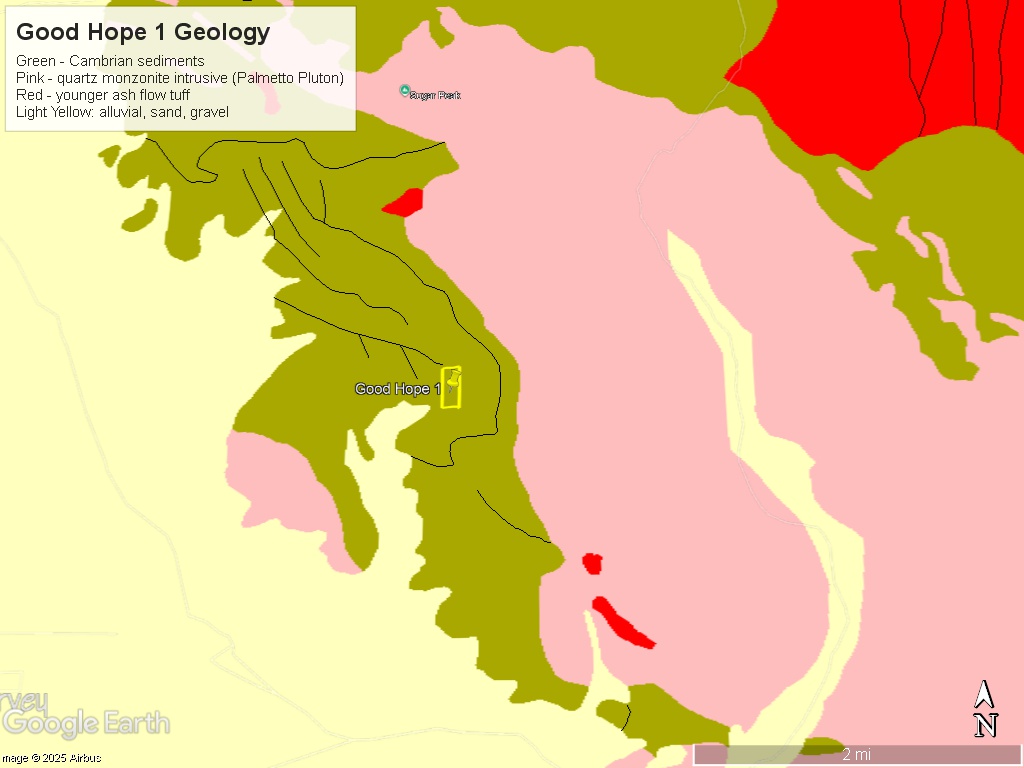 Local Geology:  The Good Hope District encompasses the northwestern part of the Cretaceous to Jurassic Age Palmetto pluton and surrounding Cambrian metasediments.