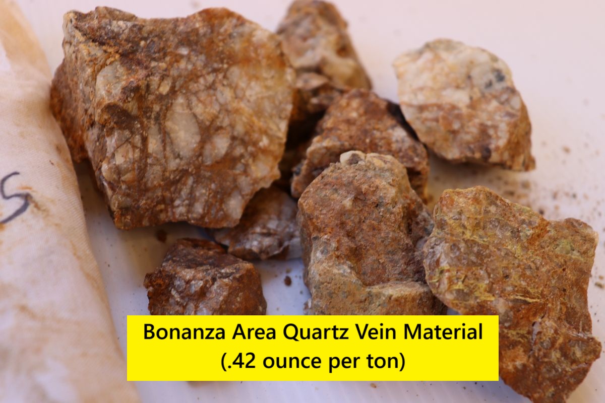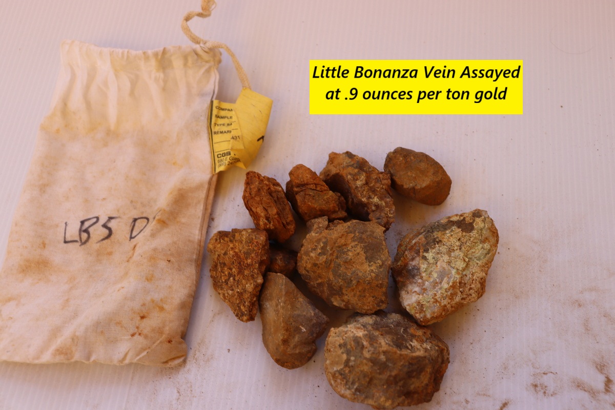 The Little Bonanza Mine and other nearby mines in the Good Hope District produce some spectacular gold grades (historical reports of up to 10 ounces per ton). One sample I took had a .9 ounce per ton gold assay from the vein material, and a .42 ounce per ton gold value from the dumps.