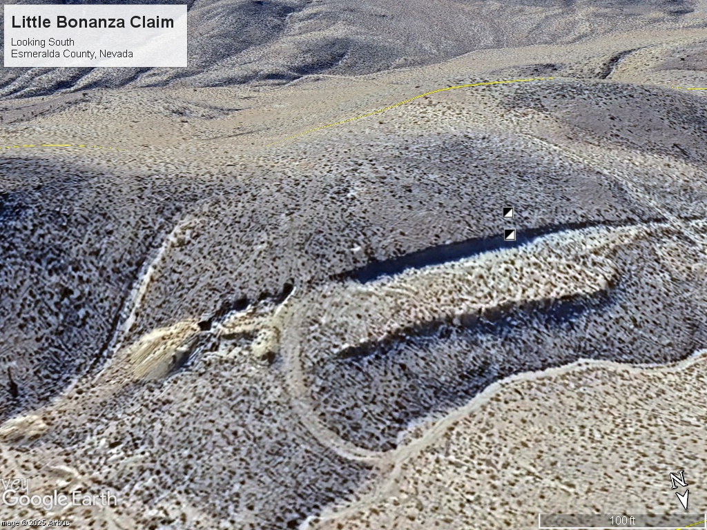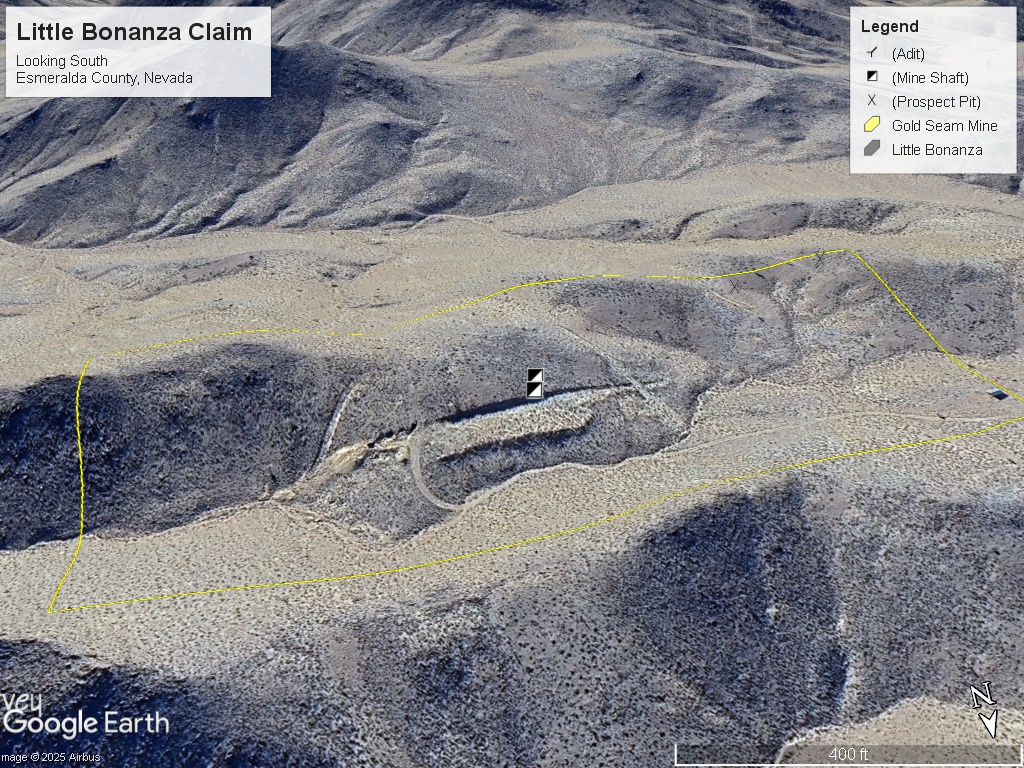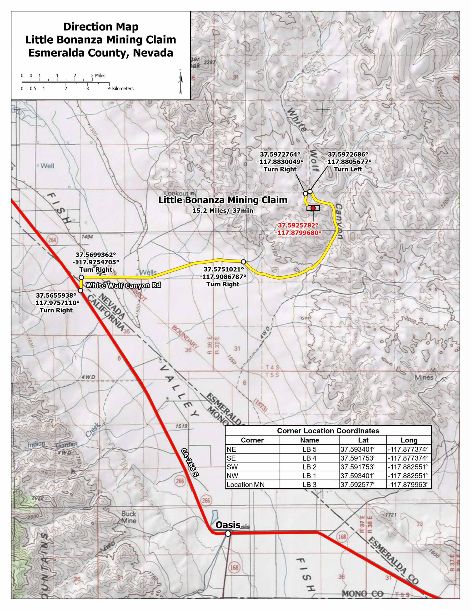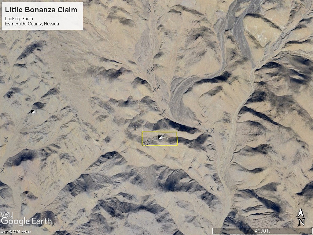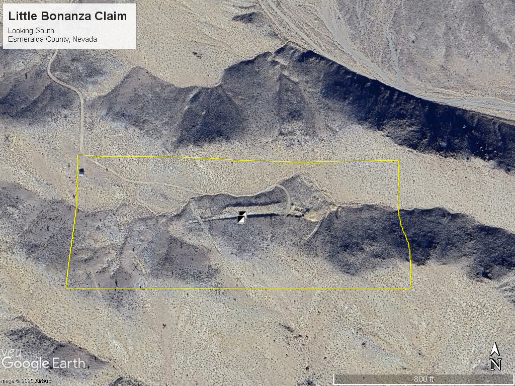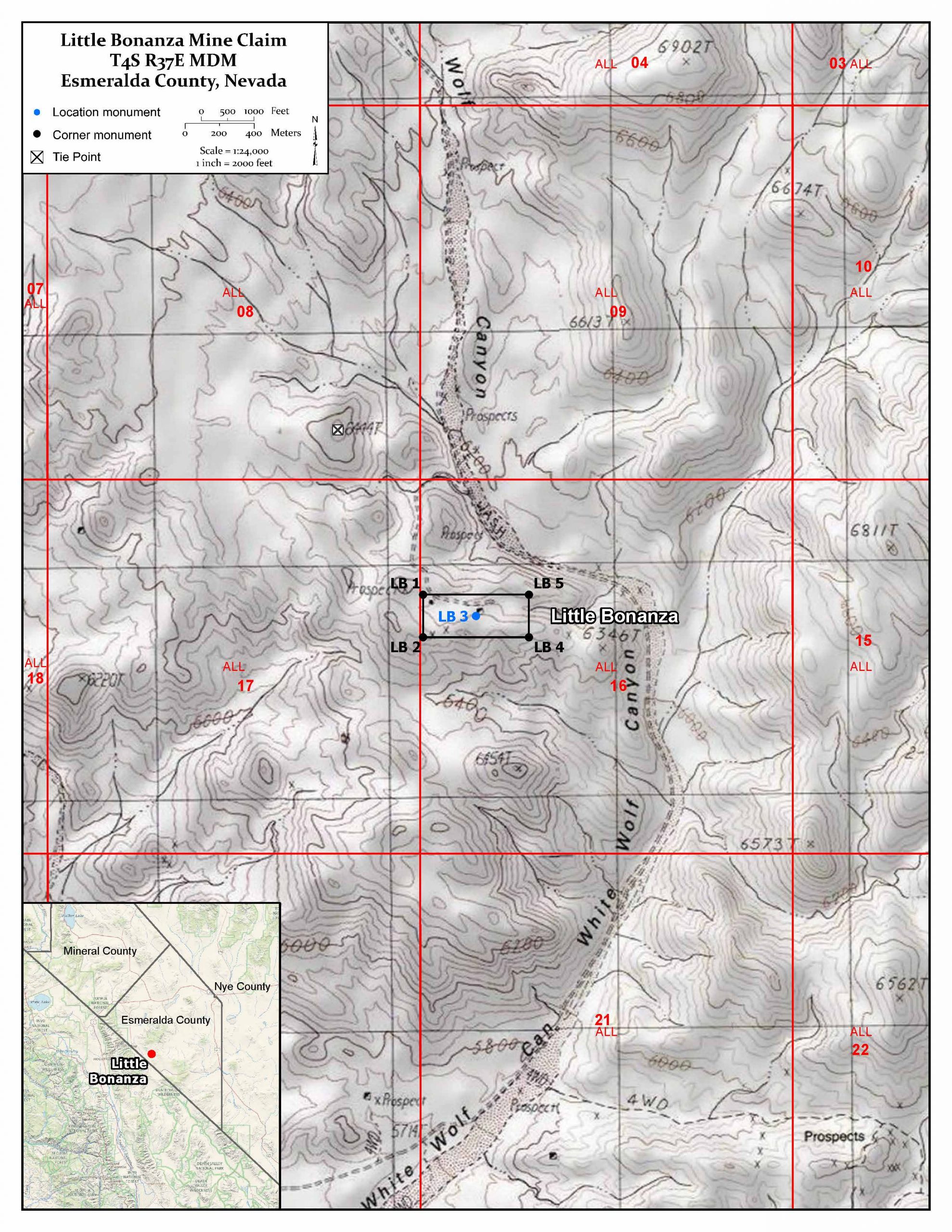 The Little Bonanza mining claim consists of one (1) unpatented lode claim covering 20.66 acres on federal land managed by the U.S. Bureau of Land Management. The claims cover a former producing gold-silver mine in Esmeralda County, Nevada