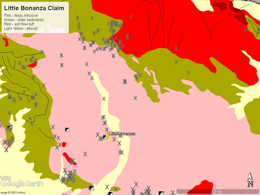 The Little Bonanza mine is within the granodiorite intrusive which is surrounded by Cambrian metasediments.